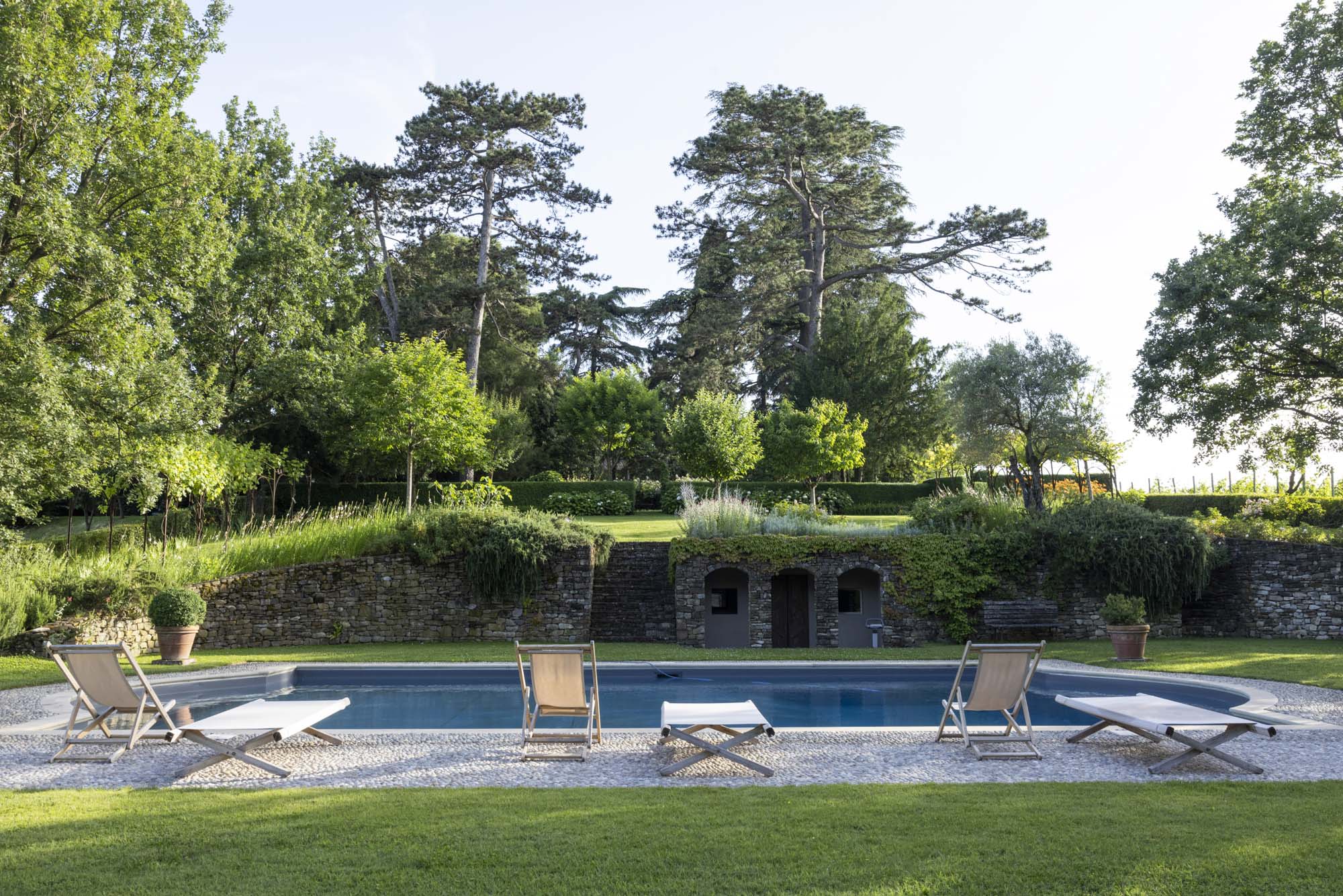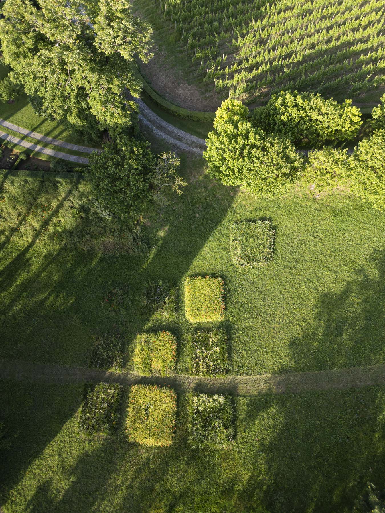 Conceived as a small oasis of horticultural experimentation by the original owner, the garden takes advantage of the mild microclimate of the Piacenza hills and is distinguished by its great botanical variety: the sunny southern side features lush mixed borders alternating aromatic herbs with roses, irises, peonies, and exotic species, whilst the northern side presents shade-loving varieties, which under the majestic Lebanon cedars find the perfect conditions to thrive.